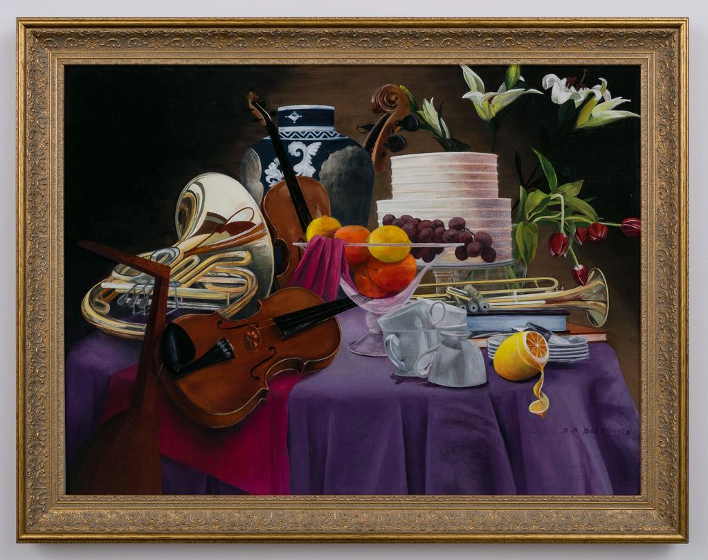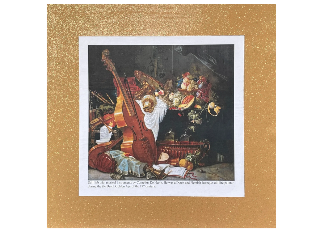 "The Musician's Table, Baroque" is a nod to the Dutch and Flemish grand masters of the 17th century. It showcases the style (simplified), subjects (instruments, fine foods and other luxuries), and glazing techniques characteristic of their Baroque-style still lifes.
