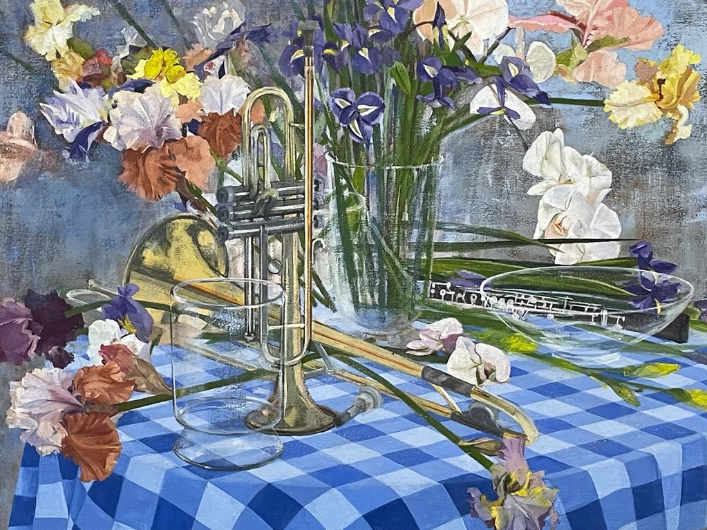 is a performance of trombone, trumpet and oboe amongst the colorful glass of vases and luxurious blooms of simple and bearded iris and an phalaenopsis orchid on the musicians’ table. (This painting is presently unfinished.)