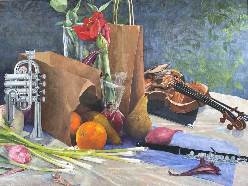 Using a round table as the setting for my paintings, I pretended it occupied a common space where symphony musicians congregated when living and performing away from home. Then I imagined the arrangements they might create there and composed them in still life. As result, my paintings depict scenes in which collections of foods, instruments, and flowers cover the tabletop. Flowers, like the luxuries placed in the still lifes of the Golden Age, represent the richness of musical notes. Glass and other reflective surfaces were used in appreciation of my teacher Rob Gratiot from the Art Students' League of Denver. The color and creativity he paints in reflections are an inspiration to me. Thanks to HB Wood Songs in Boulder, CO for graciously giving me access to the majority of instruments depicted. And appreciation to my friends Jen, Courtney, and Alice who lent me their own.