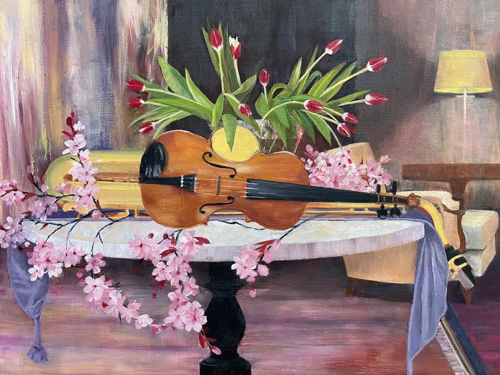"Violin with Sax" , the last of the paintings featuring the overall musician's table, is a duet between violin and saxophone, tulips and cherry blossoms. It shows the room surrounding the table in some detail.